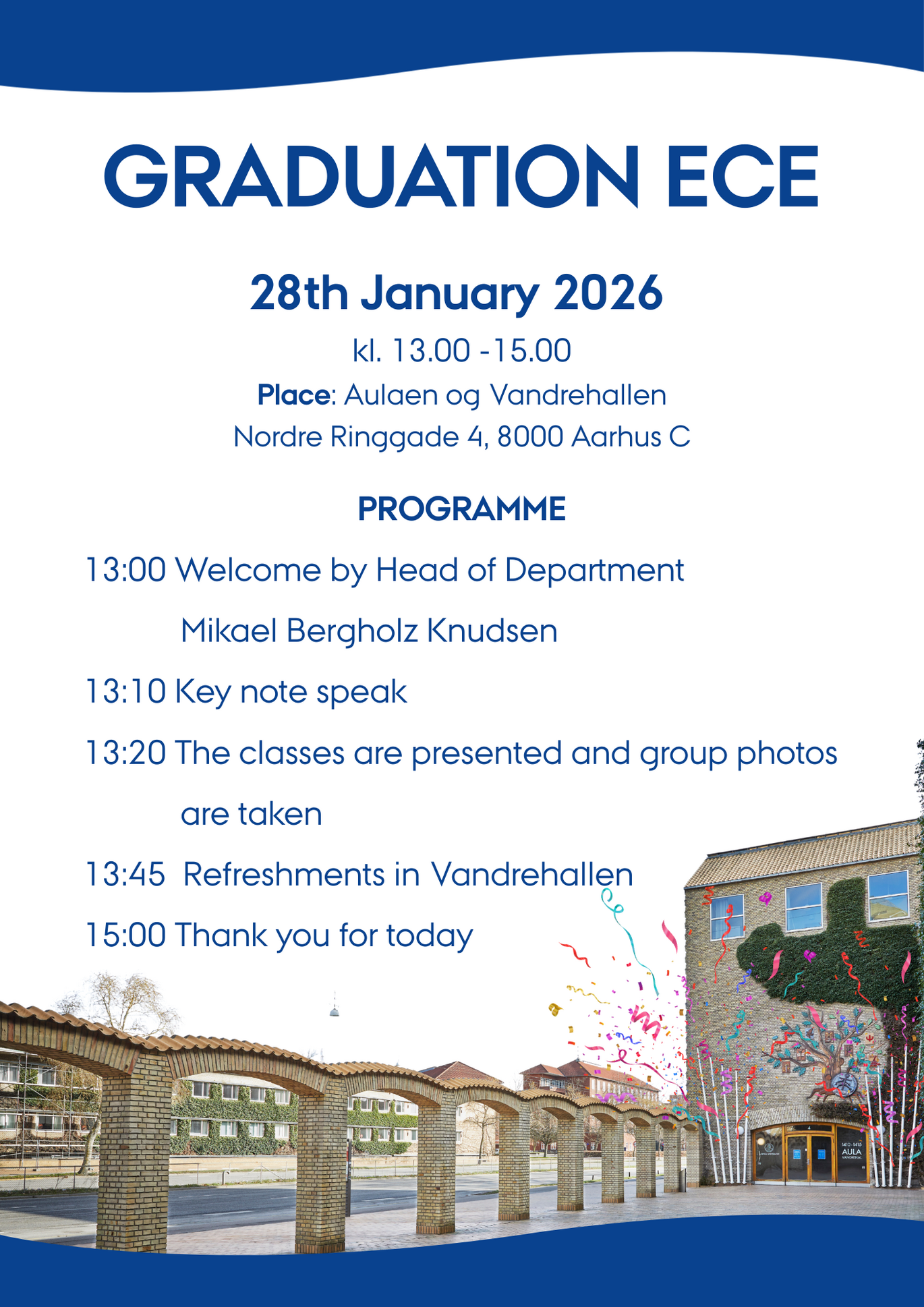 ECE winter graduation 2026 Invitation to graduation for future graduates of winter 2026. Info about event Time Wednesday 28 January 2026, at 13:00 - 15:00 Add to calendar Location Aulaen og Vandrehallen, Nordre Ringgade 4, 8000 Aarhus C