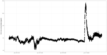 Picture of methane peak in a dairy cow barn during agitation (pumping) of slurry. As ca. 85% of the methane is produced by the cows themselves (so-called enteric methane), the peak at 6 am shows a major emission of methane from the slurry during agitation.